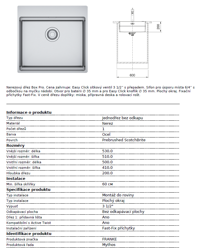 › KUCHYŇSKÉ DŘEZY › Nerezové dřezy › Dřezy bez odkapu › Spodní skříňka od 600 mm › dřez Franke BXX PRO 210/610-50 TL nerez